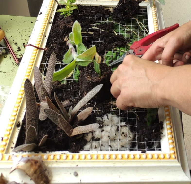 El material utilizado fue reciclado, aportado entre todo el equipo, como tablas de palets y marcos de fotos en desuso. Realizamos los marcos con un fondo para almacenar el sustrato que sustentará las plantas. Dicho "cajón" fue impermeabilizado con plástico.