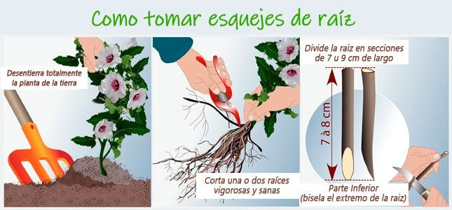 Raíces: se puede utilizar la raíz cortada en secciones o separando retoños radiculares. Las plantas recomendadas son las que tienen raíces carnosas (acanto, anémona, gordolobo, amapola oriental, lila...) y los arbustos que generan retoños (ailante, aralia, cotinus, hibiscus...) De abril a septiembre. También utilizando escamas de bulbos Y tubérculos es posible y /o separando los pequeños bulbitos que se crean alrededor del bulbo principal.