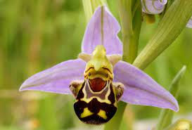 Esta orquídea es impresionante porque tiene la forma de una abeja, con las características marcas amarillas y negras, pegada a una flor rosa. Además, tiene dos pequeños polinios redondos colgantes que necesitan tan solo un ligero viento para que el polen caiga dentro de la flor y se autopolinice. Son originarias de Europa. Darwin estudió estas orquídeas y se sorprendió de que estaban modificadas en apariencia para atraer polinizadores, pero realmente no los necesitaban porque se autopolinizan.